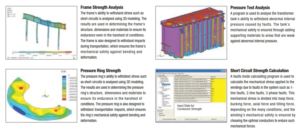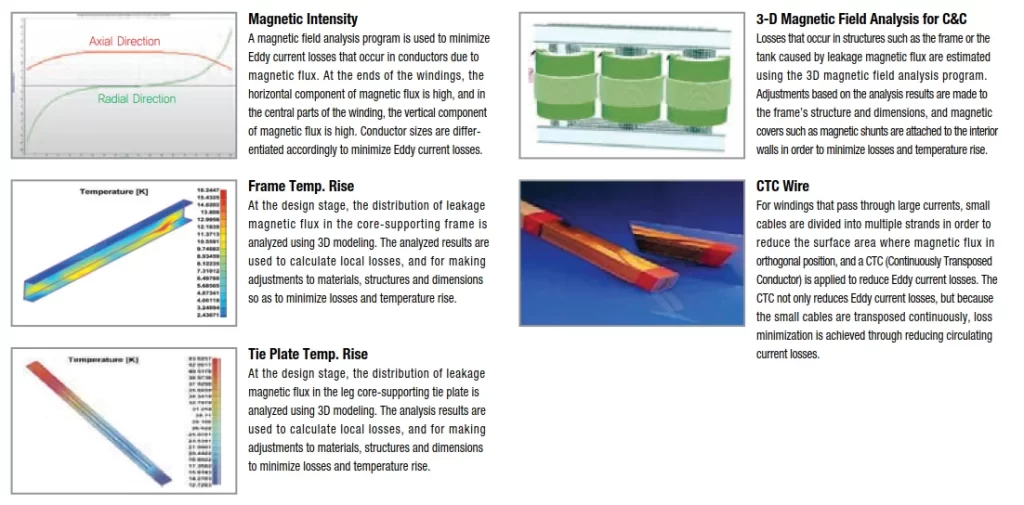 - Eddy current losses in conductors, core-supporting frames, tank walls, and clamping structures are calculated and mitigated through precise modeling.